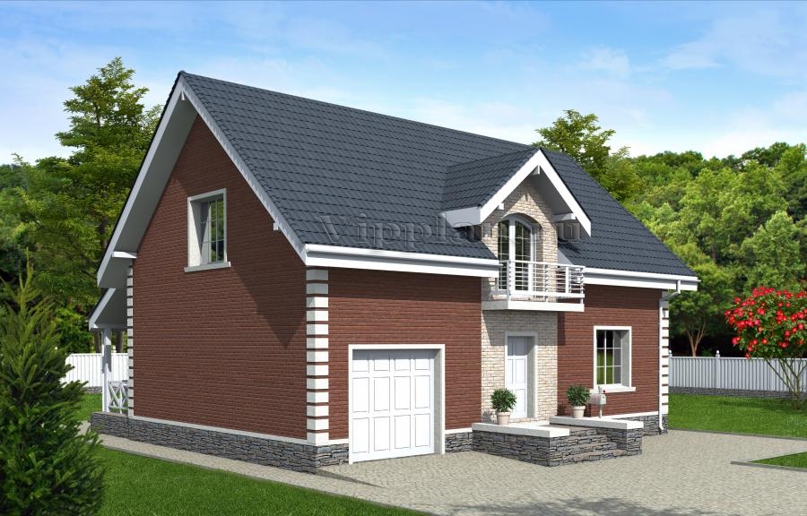 Проект индивидуального одноэтажного жилого дома с мансардой с размерами здания 12,18 x 12,48 м. Наружная отделка здания – клинкерная плитка, фасадная штукатурка. Фундамент – щелевой, «стена в грунте» (под несущими стенами). Наружные стены – из пенобетонного блока с утеплением напыляемым пенополиуретаном и отделкой бетонным сайдингом. Внутренние стены – из пенобетонного блока. Перегородки – из пенобетонного блока. Пол 1-го этажа – пол по грунту. Межэтажное перекрытие – сборные ж/б плиты. Перемычки: монолитные ж/б и из профиля проката. Крыша – многоскатная. Кровля – металлочерепица. Окна – металлопластиковые. Лестница – металлическая (деревянная по металлическому каркасу).